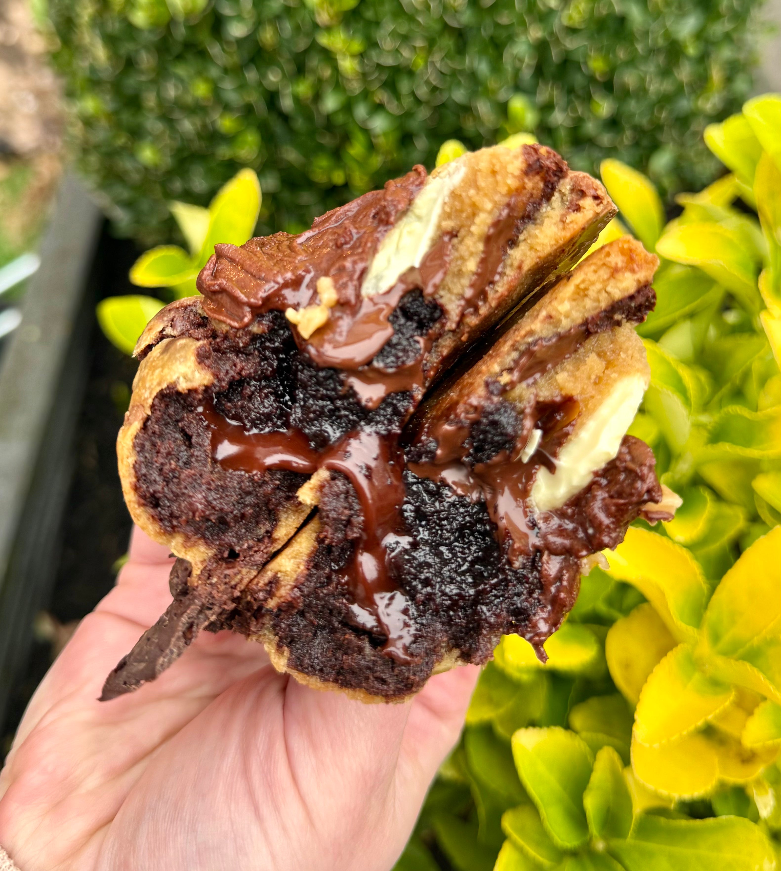 Then, the pièce de résistance. We add homemade chocolate fudge sauce to the mix to create a cakie with a distinctive crunch and flavour.